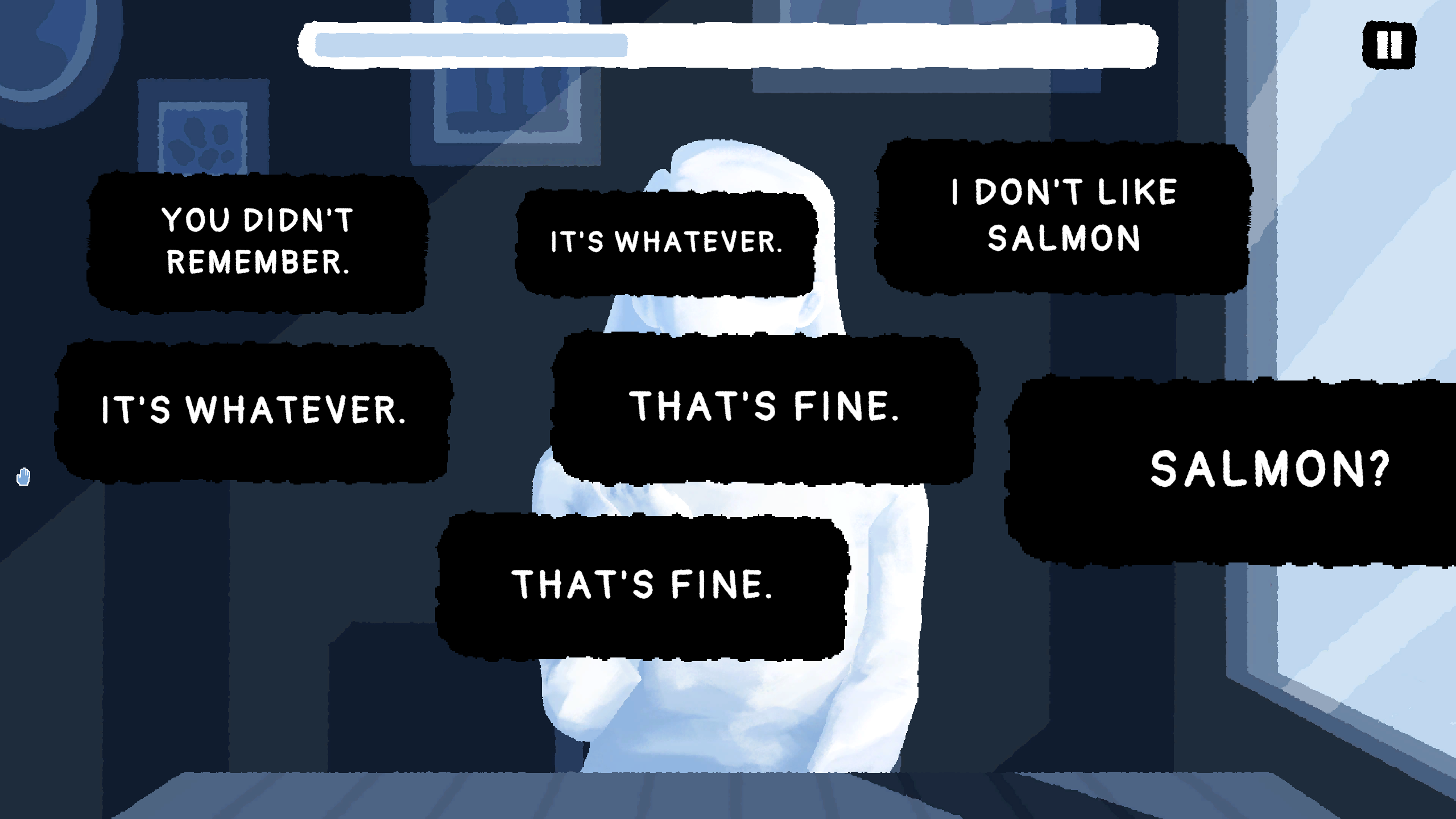 As the mother talks, dialogue choices appear in real time. However, your brain will be riddled with intrusive thoughts (doubts, fears, etc.), that may bleed into the real world. As the conversation gets heavier, these panicked thoughts may overwhelm you.